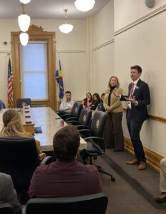 Colorado legislators Lisa Frizell and William Lindstedt speak in 2024 to the Leadership Colorado class at the state Capitol.