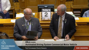 Colorado state Sens. Tom Sullivan and Larry Liston explain their bill on regulating autonomous commercial vehicles to the Senate in April 2025.