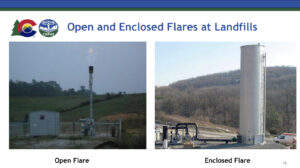 A Colorado Air Pollution Control Division slide shows the difference between open and enclosed flares.