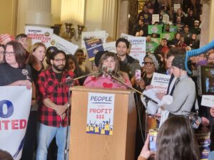 A Starbucks labor organizer speaks at a January rally at the Capitol in favor of changes to the Labor Peace Act.