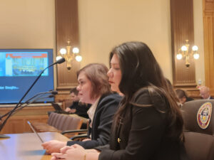Meghan Dollar of the Colorado Chamber of Commerce and Rebekah Hernandez of the Denver Metro Chamber of Commerce testify against Senate Bill 41 on Thursday.
