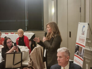 Grand Junction Area Chamber of Commerce President/CEO Candace Carnahan speaks at a dinner earlier this month whose attendees included Rep. Rick Taggart (foreground).